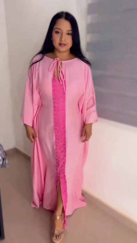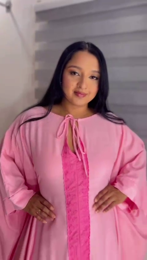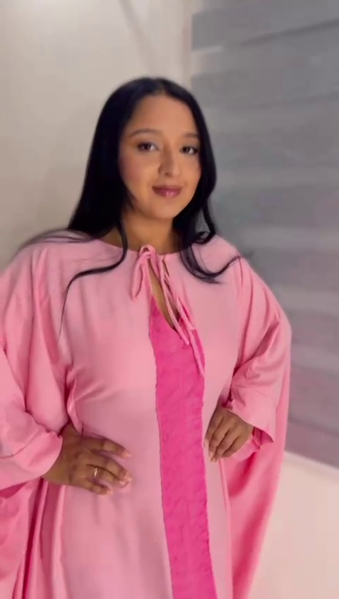 Confeccionada en tela fluida de tono rosa coral, esta pieza destaca por su panel central rizado en rosa profundo, que recorre verticalmente el diseño como un vórtice simbólico, evocando la fuerza de las trombas marinas y los algoritmos de identidad.